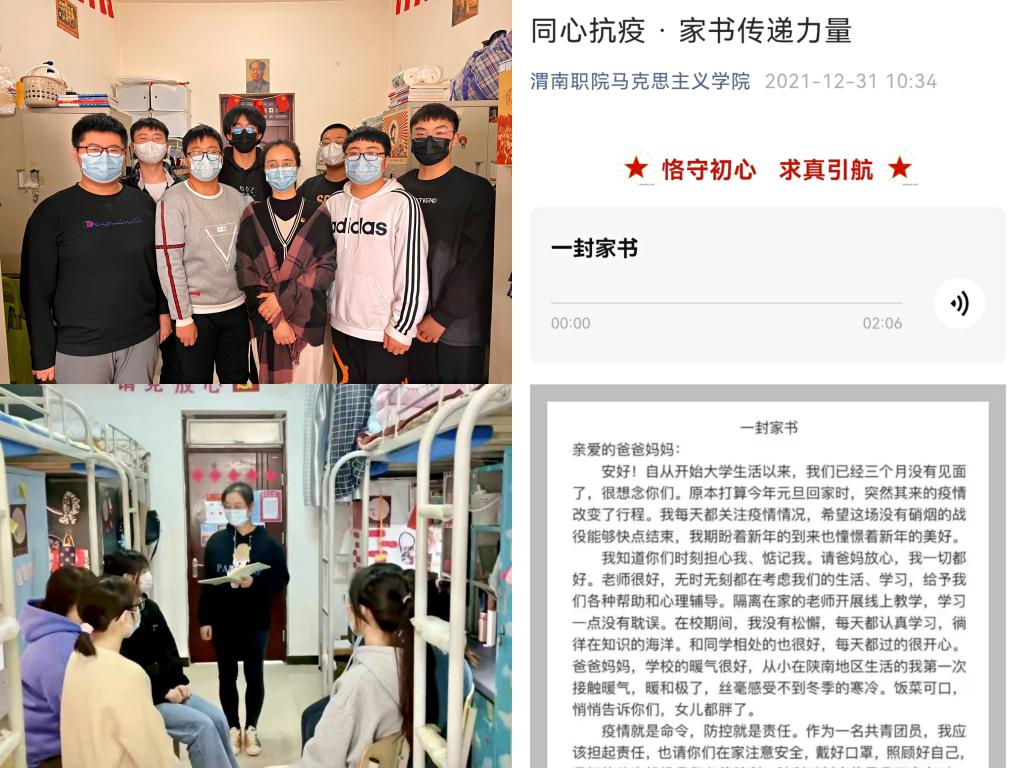 为鼓舞全体师生同心抗疫、共渡难关的信心,beat365精心策划了“同心抗疫·家书传递力量”“同心抗疫·思政微课堂”系列栏目,通过微信公众号平台推送宣传。家书传递温暖、传递力量,在家书中学生向父母表达思念与感恩,截至目前,共收到家书百余封,推送11篇。青年教师石欣欣、副教授余金枝、向琪三位老师,结合课程内容和疫情防控工作实际,分别以“践行伟大抗疫精神”“培养法律意识”“大学生心理调适方法”为内容,深入学生宿舍进行微讲授,倾听学生心声、拉近师生距离、增进师生情谊。不论是家书传递还是思政微课堂,都是推进思政课守正创新的积极践行,实现思政“小课堂”和社会“大课堂”同频共振,在战疫中凝聚强大精神力量。