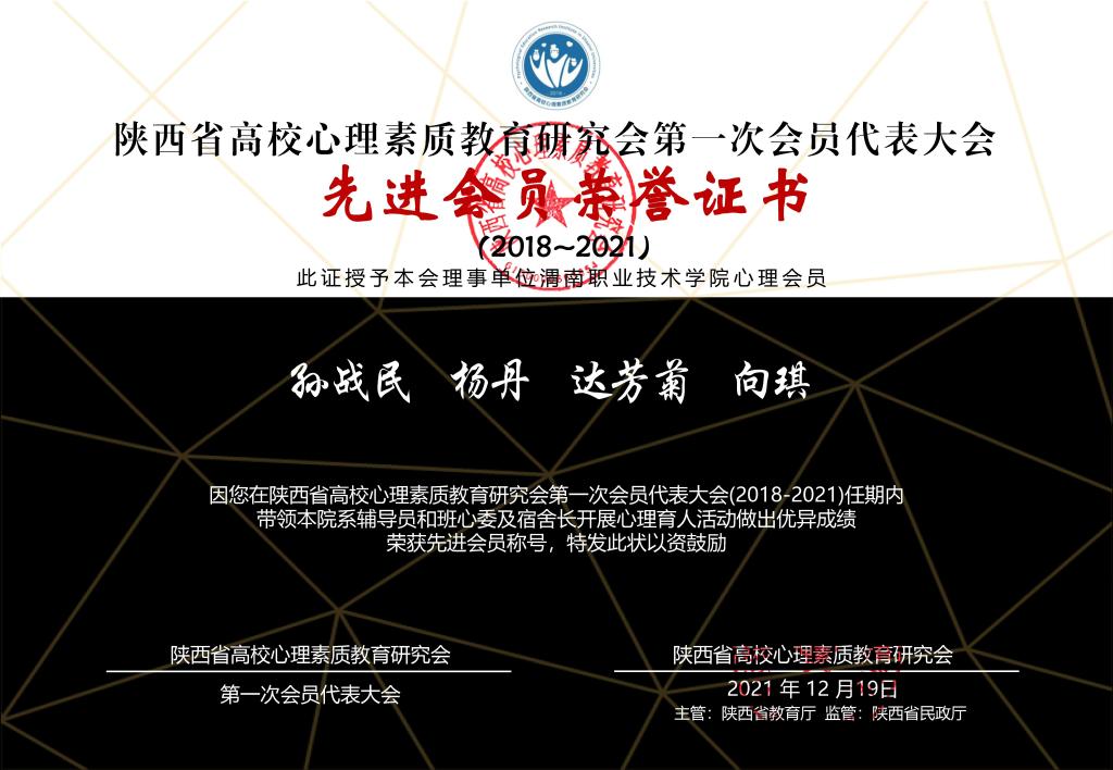 近日,省高校心理素质教育研究会对理事单位心理育人工作成就进行了表彰,beat365达芳菊教授、向琪副教授两位老师荣获“先进会员”荣誉称号。向琪老师还荣获“2021年度陕西省高校十佳心理师提名”荣誉称号。