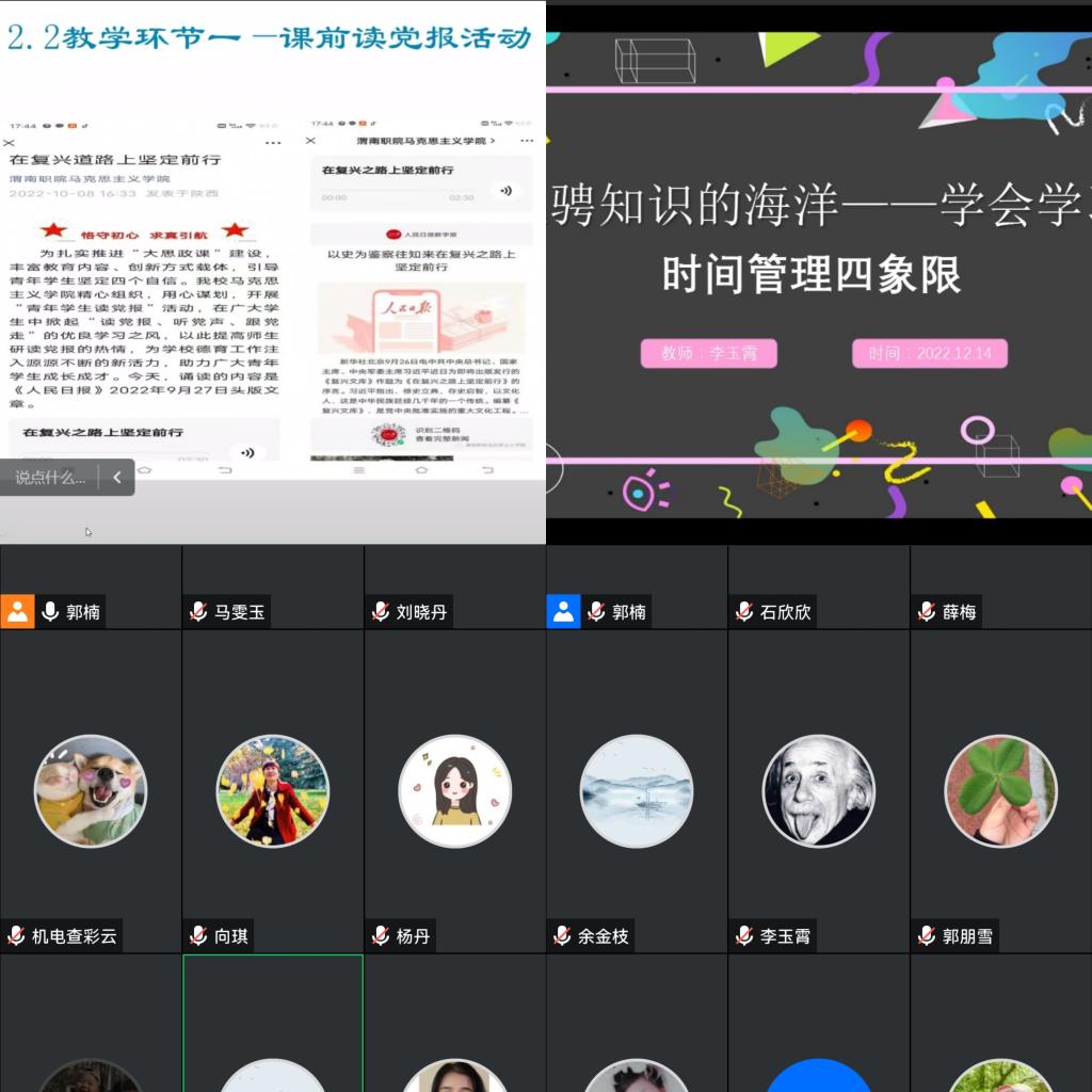 为提升思政课教学水平,12月15日下午,beat365平台官方网站根据学校教学能力比赛要求线上开展教学能力比赛初赛,德法与心理教研室的2个参赛团队参加了本次比赛。院长史改侠、副院长王晓莉、副高以上职称教师达芳菊、韩秀阁、王爱、常俊侠6位老师担任评委,比赛由王晓莉主持,无课教师观摩了比赛。