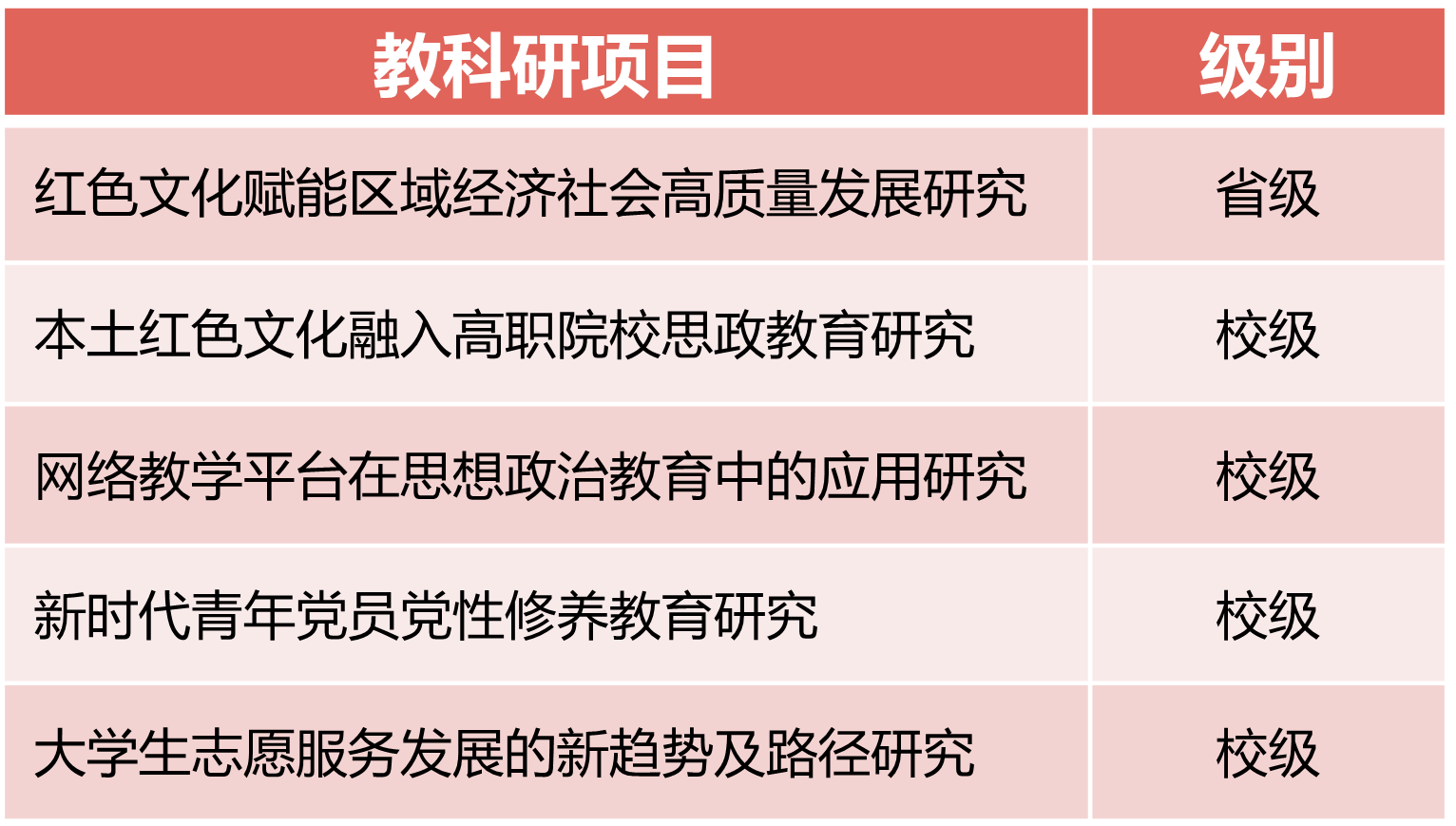 申报省社科联课题1项,校级教改课题立项4项,结题1项。获批校级思政课创新团队1个、教学成果奖一等奖1项、在线开放课程一门、校本教材立项1个。