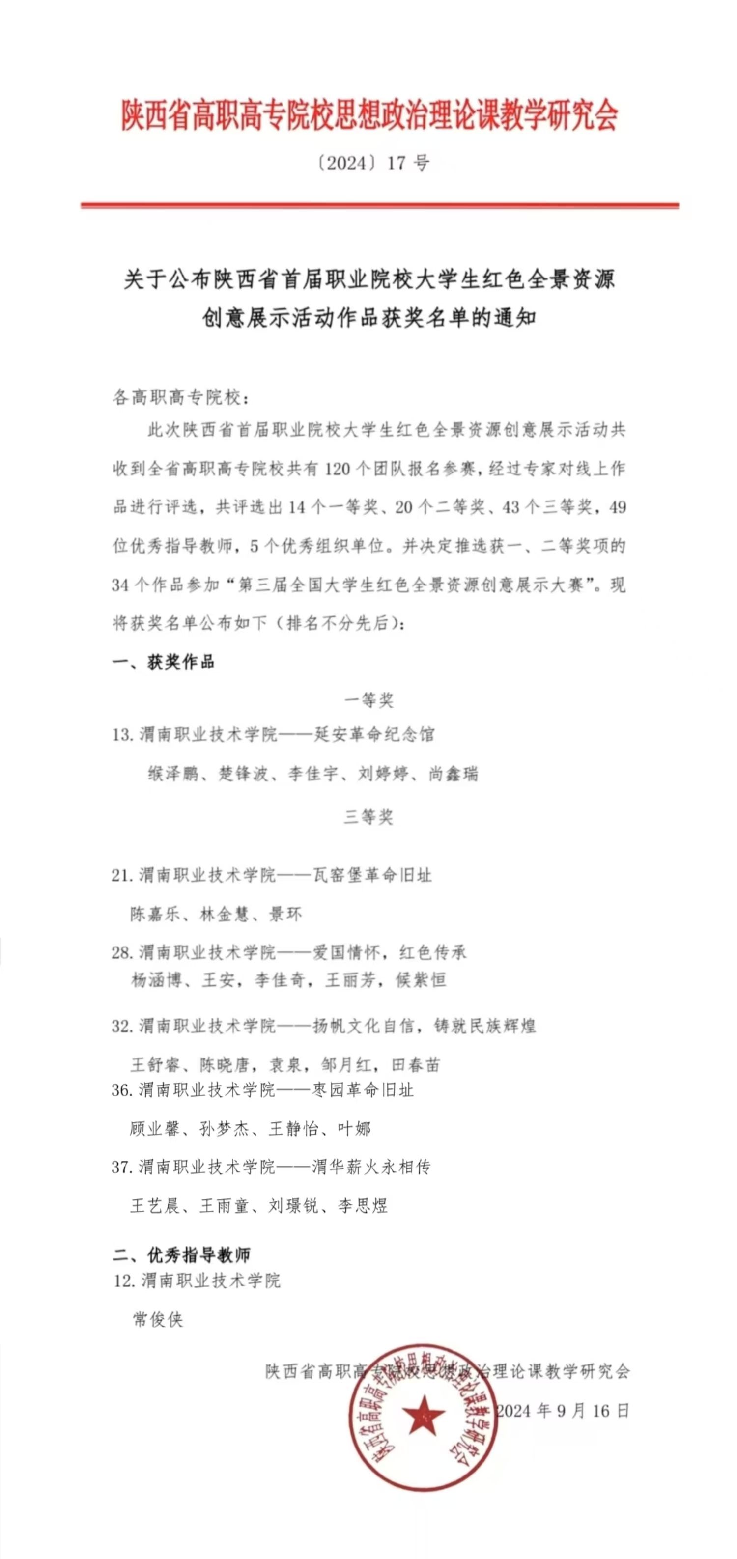 近日,陕西省首届职业院校大学生红色全景资源创意展示活动圆满落幕,来自全省多所职业院校的优秀作品齐聚一堂,共同展现了青年学子对红色文化的深刻理解与创新传承。在这场激烈的角逐中,由beat365平台官方网站常俊侠、陈铮、薛梅、刘晓丹四位教师精心指导的学生团队脱颖而出,凭借独特的创意、深刻的内容及精湛的技术,荣获了本次活动一等奖和三等奖的好成绩,常俊侠副教授被评为优秀指导教师。