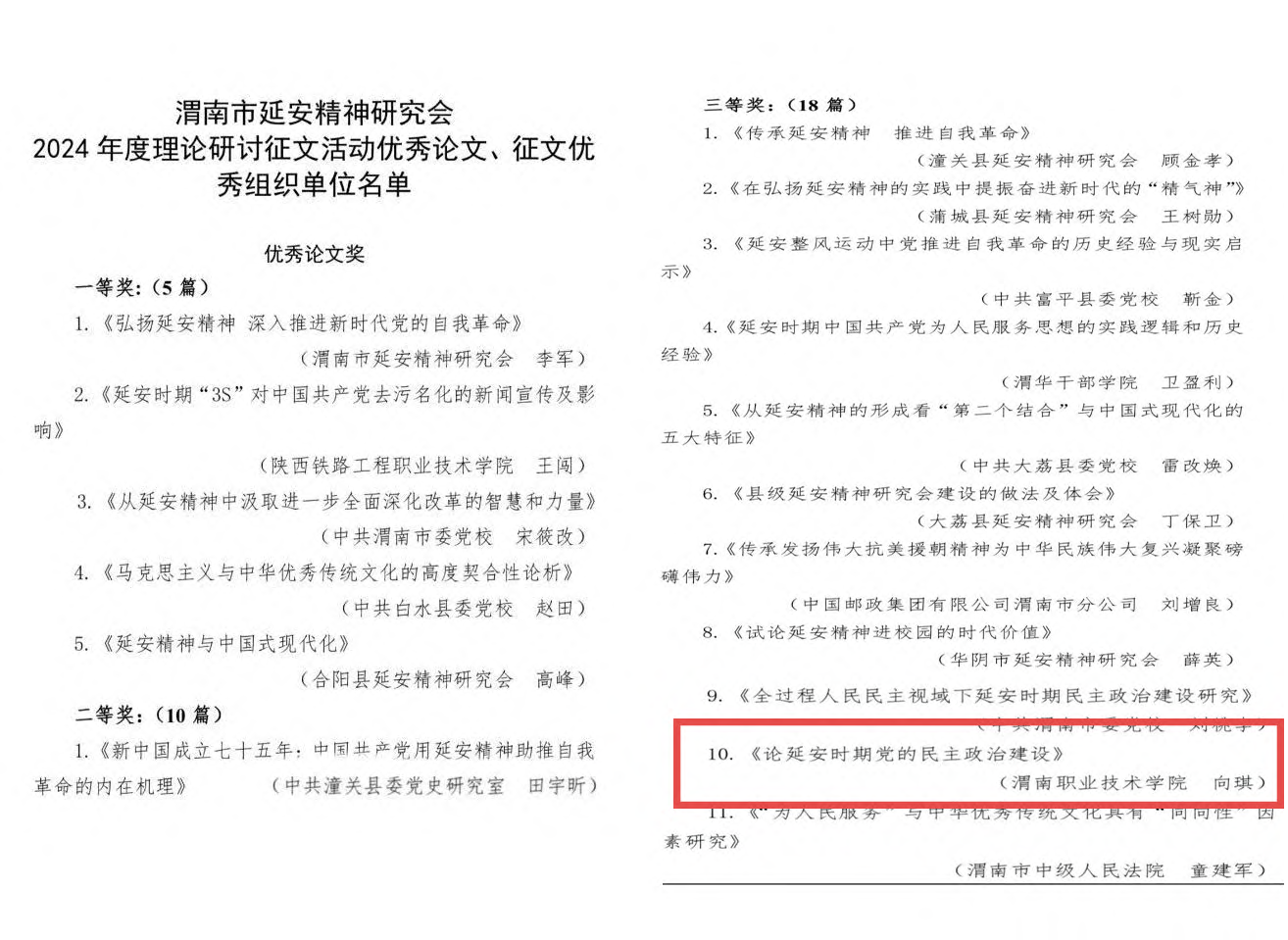 为深入学习贯彻落实党的二十届三中全会精神,加强beat365教师理论研究工作能力,今年4月,beat365组织教师积极参与申报渭南市延安精神研究会在全市发起的2024年度理论研讨会征文活动。本次共征集文稿266篇,评出一等奖论文5篇、二等奖论文10篇、三等奖论文18篇、优秀奖论文15篇,征文优秀组织单位4个。beat365教师向琪副教授撰写的《论延安时期党的民主政治建设》获三等奖好成绩。